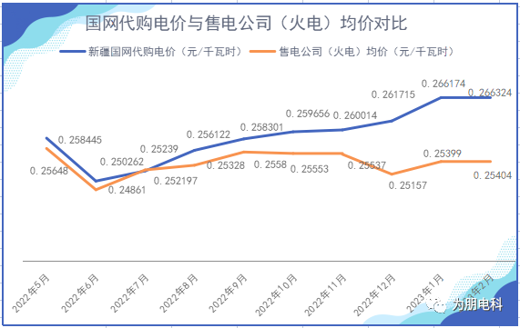 新疆電力交易中心公布的 2023年2月新疆電力市場(chǎng)交易火電均價(jià)(即售電公司交易火電均價(jià))為0.25404元/千瓦時(shí),國(guó)家電網(wǎng)公布的2023年2月代購(gòu)價(jià)格為0.266324元/千瓦時(shí),現(xiàn)將2023年2月國(guó)網(wǎng)代購(gòu)電價(jià)與售電公司市場(chǎng)均價(jià)對(duì)比如下: